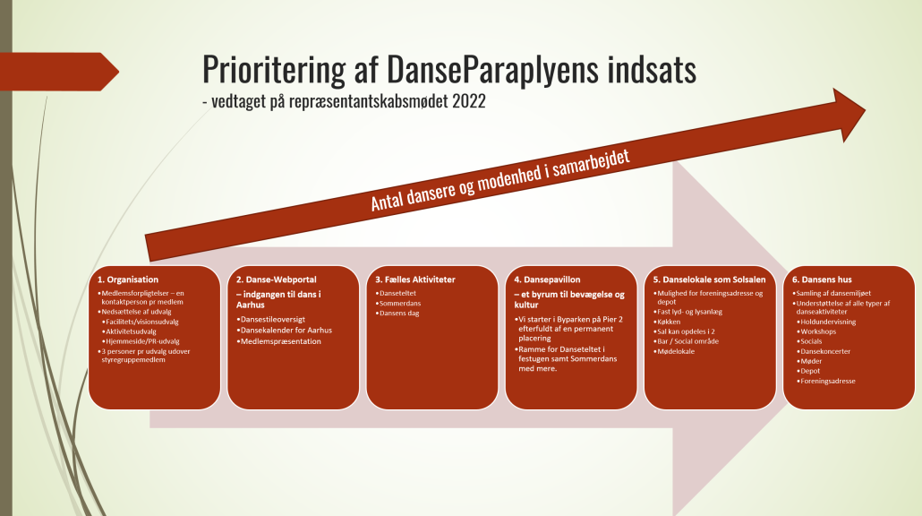 Vi vil arbejde for at udvikle en danse-webportal for Aarhus med en arrangementskalender samt en introduktion til alle dansestile, og ikke mindst musikken og kulturen bag. Vi vil også arbejde for at få oprettet en permanent dansepavillon centralt i Aarhus til afholdelse af fx Sommerdans og ikke mindst et “Dansens hus Aarhus” med henblik på at skabe et stærkt, bredt favnende og mangfoldigt dansemiljø, som kan sætte Aarhus på Danmarks/verdenskortet som Dansens by.